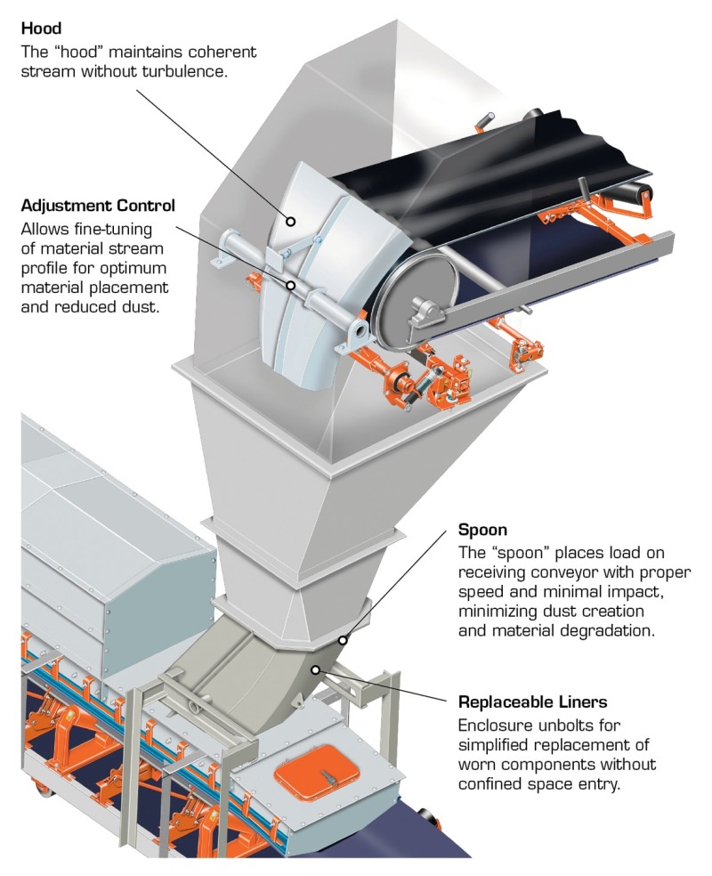 By managing the material speed and direction, the new MARTIN® Inertial FlowTM transfer chutes (Fig.) can minimize impact and wear on liners and belts, while containing the dust and spillage that are often generated at transfer points. The engineered flow chutes employ special geometries that capture and concentrate the material stream as it travels through the chute. Every design is tailored to suit the specific ma-