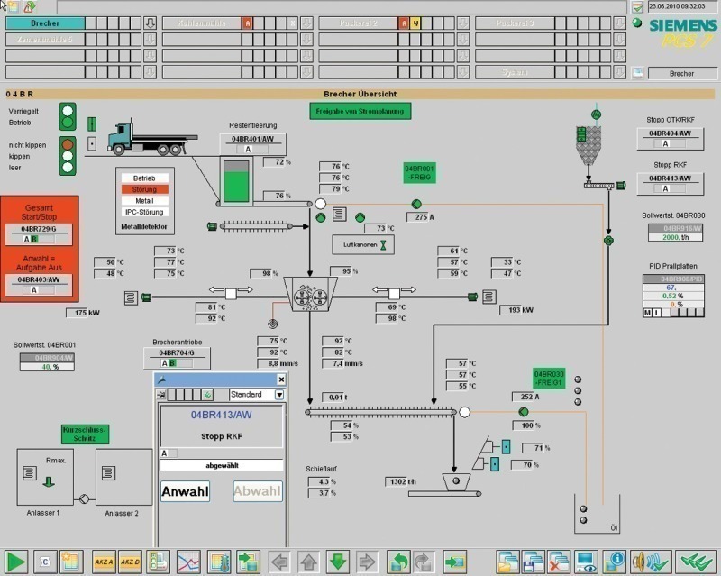 Siemens developed CEMAT especially for the cement industry. The numerous advantages of CEMAT V7 make it more and more popular. Error diagnosis in particular has been improved: Problems can be solved using detailed error indication and high performance plausibility logic. This means less effort for electrical engineers and mechanics, thereby reducing downtimes. The error diagnosis displayed before the start make test starts superfluous, thus saving energy and improving capacity utilization. As staff can rely on the information of the error indication, system acceptance is guaranteed. The control room and employees in management receive information (Figs. 2 and 3) indicating possible error sources and allowing operators and shift supervisors to identify them fast and coordinate repairs and start sequences. Weak points can be analyzed and eradicated through error analysis and statistics.