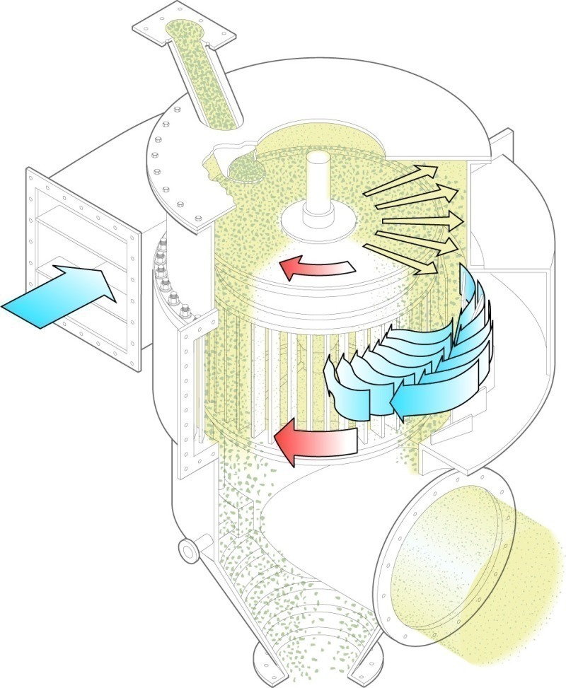 In this type of separator (Fig. 3) the material to be separated is guided onto the distributing plate by two diametrically arranged inlets. The distributing plate rotates at high speed, so that the material is flung over the outer rim and impacts against the side walls. This disintegrates any clumps and the dispersed material then falls into the separating area. The actual separation process takes place during this free fall. A flow of air entering the separating chamber through the inlet spiral is tangentially diverted by guide vanes into the falling material. This transverse current of air carries the smaller and lighter particles of material through the blades of the rotor and into the separator cage. The air stream carries them to the cyclones where they are collected as fines. Large, heavy particles, in contrast, are not entrained by the air stream and fall into the grit discharge cone before being returned to the mill. The separator provides high sharpness of separation and efficiency (fine produce yield) thanks to its low bypass rate. Thanks to the variable-speed rotor drive, highest-range cement finenesses are attainable and the separator’s sealing air system ensures that no oversize particles enter the fines.