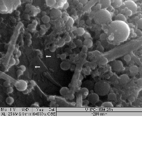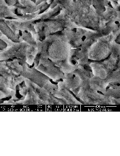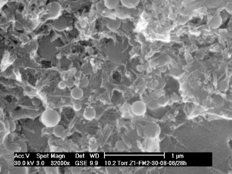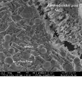 (2–5 kV) on fresh, uncoated fractured surfaces. In the above chapter it was mentioned that after 28 hours of hydration the first C-S-H phases were visible in the UHPC mixture M2 containing GGBFS. In Figure 4 it is visible that two days after water addition numerous short tapered C-S-H phases have developed between SF-particles and other fine additives (GGBFS, quartz powder) which create a very dense microstructure. Furthermore 2 µm big crystal aggregates were punctually detected in water stored or heat treated GGBFS samples (M2), which were determined by means of electron beam microanalysis (EDS) as AFm-phases [17]. This monophase was not observed in mixture M1. The formation of AFm-phases is attributed to additional aluminium introduced by GGBFS. No AFm-phases were detected with X-ray powder diffraction. This is due to the fact that this phase exists only in low amounts and below the detection limit of the method.