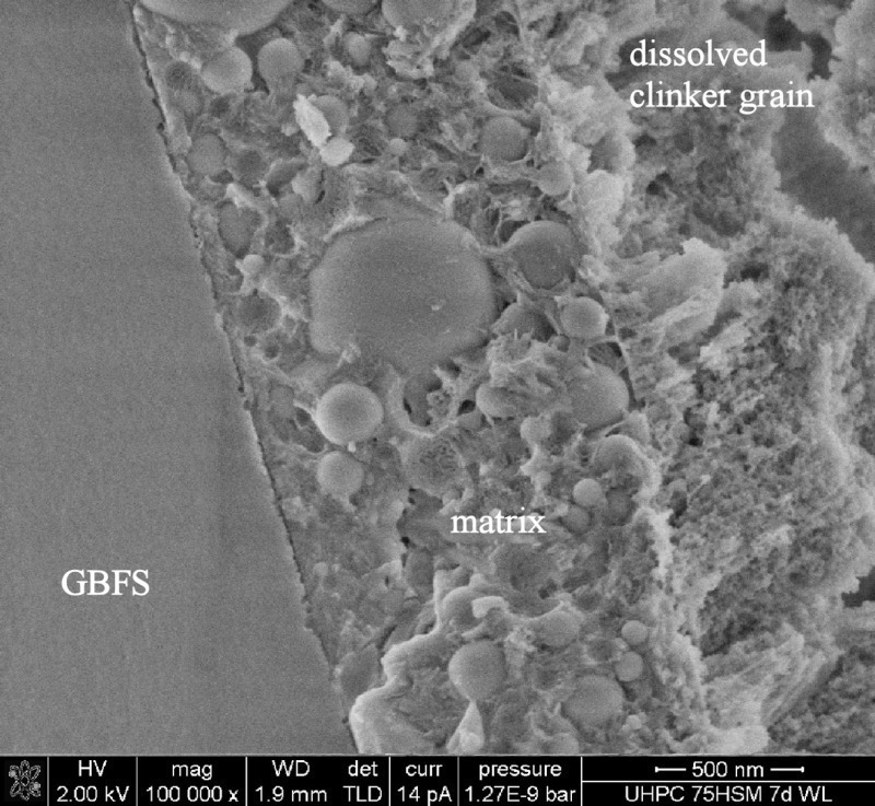 With the hydration process progressing (7 days) a dense UHPC microstructure develops in both concretes (Figs. 5 and 6), however there are still high amounts of unreacted SF-sphericals embedded with a wide grain size distribution. These particles show a smooth surface without visible dissolution structures. This suggests that no or only a marginal pozzolanic reaction occurred so far. Incompletely reacted GGBFS particles are widely existent in the UHPC matrix. The surface shows only minor dissolution structures. After nine days of hydration single ground granulated blast furnace slag particles show a reaction rim of approximately 130 nm. Between 14 and 28 days the SF-particles show significant dissolution structures in mixture M2 (Fig. 7). At an age of 28 days only minor dissolution structures on spherical silica fume particles were observed in mixture M1 (Fig. 8). Furthermore electron microscopic images show, that between SF particles and in the transition region of GGBFS and UHPC matrix foil-like C-S-H phases with a thickness of 2–6 nm have developed, whereas in mixture M1 short, tapered C-S-H phases have developed.