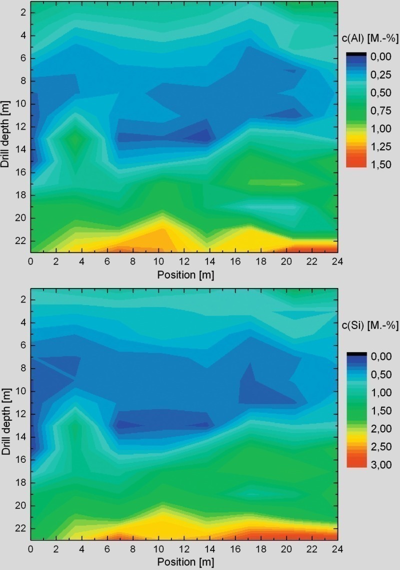 The possibility of fast generation of a detailed deposit model with the help of laser analysis was shown by drilling 12 holes in a 2-m borehole grid. Figure 7 shows as an example the results for Al and Si. The spatial resolution of the model is 2 m. Apart from the cover layer, three layers can be identified. In the depth range 6 –13 m there is a layer with lower content (<  0.2  %) of Al and Si. From 16 m to 20 m depth, the Al content is around 0.75  %, the Si content 1.5  %. Below this, the contents increased substantially up to 1.5  % for Al and 3  % for Si. So laser analysis can be used for the online development of a precise model during blast-hole boring.