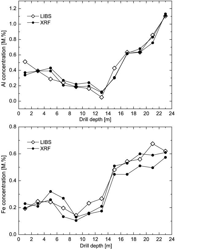 Figure 6 shows by way of example the comparison between the laser analysis results and the results of the two XRF laboratories for the elements aluminium and iron for a single drillhole. The concentrations determined with the laser lie close to the values returned from the two XRF laboratories. This shows that the laser analysis is not inferior to XRF analysis in accuracy and correctness.