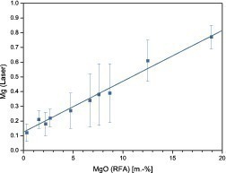 The measurement process was calibrated as described above with production samples whose MgO content had been determined with X-ray fluorescence analysis. Figure 8 shows a calibration curve obtained from static samples. Measurements were taken at 10 measurement points distributed over the surface of the samples, from which the sample for XRF was also taken. The LIBS measurements can be linearly calibrated to the XRF with a correlation coefficient R² of 0.99, which corresponds to a process standard deviation of 0.74  % MgO. The high standard deviation of the individual measurements (error bars in Fig. 8) can be attributed to the inhomogeneity of the samples. For measurements on moving specimens, the process standard ­deviation rises to around 1.3  % MgO, since here measurements are taken at other automatically selected points of the specimens, which do not represent the same spatial averaging as the XRF analyses. The scattering of the individual measured values is not critical for the characterization of the composition of a material stream, where based on temporal averaging, a conclusion can be made with regard to the mean content. How far localized laser direct analysis is sufficiently representative for ­effective single particle sorting can only be established in ­sorting tests under realistic conditions.