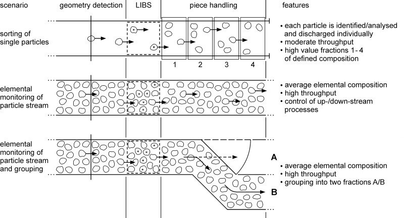 With laser direct analysis, the material composition of the extracted raw material is determined online in real time. This facilitates a large number of applications in raw materials extraction and processing, of which two applications for the limestone industry are presented as examples. For processing, in combination with processes for singling, detection and discharge of particles, an efficiently operating sorting system was realized, In raw materials processing, online analysis, however, can be used in different configurations. Figure 12 shows the different approaches. Besides the previously described single particle sorting, both straight characterization of the material stream, where based well as grouping of the stream on the basis of temporally averaged analysis results are possible.