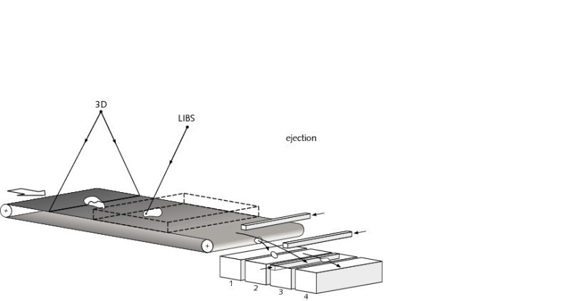 The material to be sorted with a particle size of 50 –150 mm (Fig. 3) is first separated into single particles and then fed onto a belt conveyor with a belt speed of 3 m/s. As shown in Figure 4, the single particles on the belt are identified optically and their position and geometry are determined. Then the laser beam is specifically directed at the single particles for analysis. The results of the analysis are evaluated in fractions of a second and a sorting decision is made for every single particle. Based on the analysis and position information, the compressed air jets in the discharge unit are actuated and controlled in such a way that the individual particles can be separated and discharged in two or more fractions. Thanks to the fast direct analysis, the different stages in the sorting process can be arranged practically seamlessly downstream of each other. The conveying distance from 3D identification to the end of the belt is less than 2 m. To ensure that the individual particles still remain on the belt, a sufficient stabilization zone must also be provided upstream of the sorting unit.