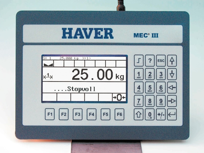 The MEC® III is not only a weigher, it is responsible for recording the weight and controlling the weight-dependent material flow in the filling spouts and secondly, it also takes over control work such as valve bag closing and the discharge from the packing machine. The MEC® III is the first self-actuating weigher with a European design approval, which HAVER & BOECKER received in 2007. The graphic operator panel (Fig. 2) enables a dialogue with the machine operator in almost every national language. Because of its Ethernet capability, the filling spouts can also be operated externally. This user-friendly concept makes the MEC® III accessible for remote diagnostics and software downloads via the internet. A quality assurance conforming operational data recording is also possible with the MEC® III network, which makes manual checks and records redundant. The MEC® III measurement system enables a maximum weighing range resolution of 6000 parts. That is a top value in the field of self-actuating weighers for filling. The European-wide MID approval (MID = European Measurement Instrument Directive) and many other design approvals outside Europe make HAVER & BOECKER with its MEC® III an ambitious specialist in electronic weighing.