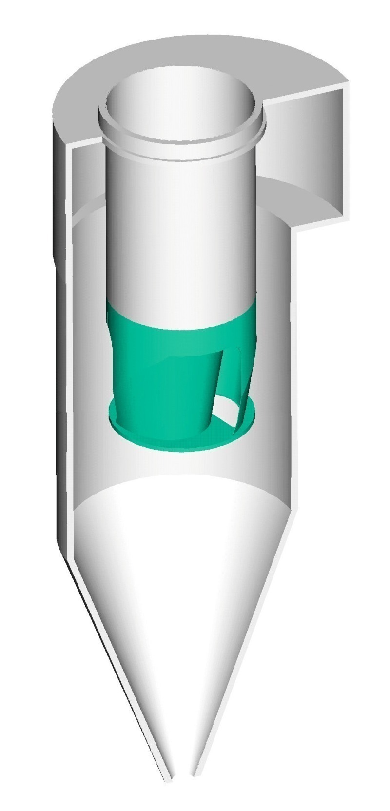The function of the dip tube of a cyclone is best described by the term “vortex finder”. It takes the still rotating solids-laden gas and leads it out of the cyclone. This results in highly unfavourable fluidic conditions, which are reflected in the high proportional pressure loss of the dip tube. Depending on the loading degree, this can account for up to 90  % of the total pressure loss.