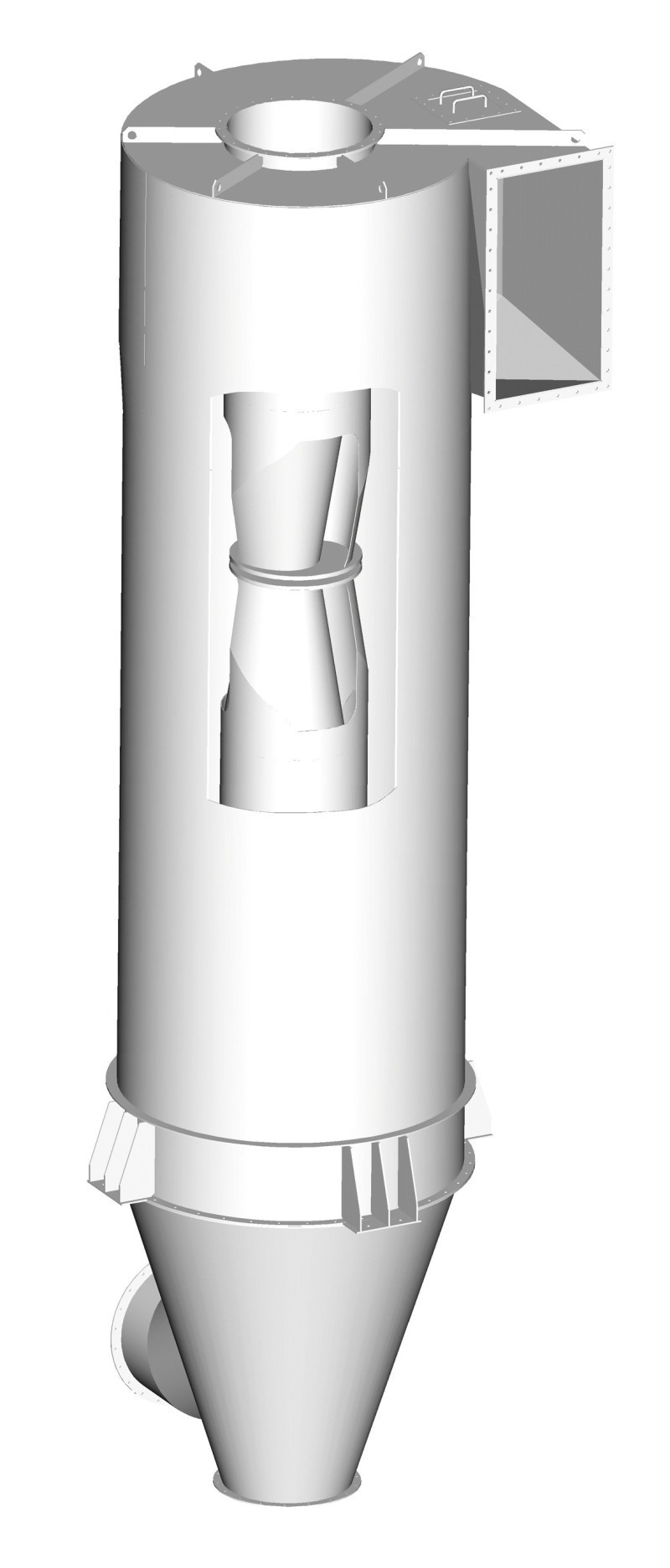 Efficiency Cyclones (Fig. 1), A TEC-HEC for short, frequently differ from other cyclones on account of their comparatively high cylinder body. Another feature is the form of the inlet cross-section. The tapered form prevents the settling or caking of material in the inlet channel and, as a result, guarantees defined flow conditions at the inlet over a longer period.