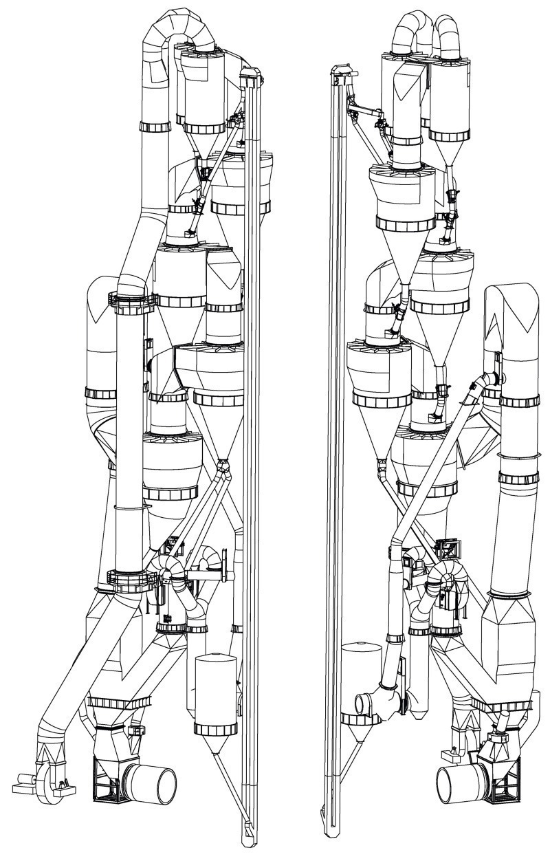 State of the art for pre-heating the raw meal in the cement ­pyroprocess is the application of a suspension heat exchanger (Fig. 4). The suspension heat exchanger is based on a discontinuous counterflow principle. For the process flow, this means that after every gas-solids heat exchange in the suspension, this is re-separated. Both the now cooler gas and the warmer solids go in to the next stage opposite.
