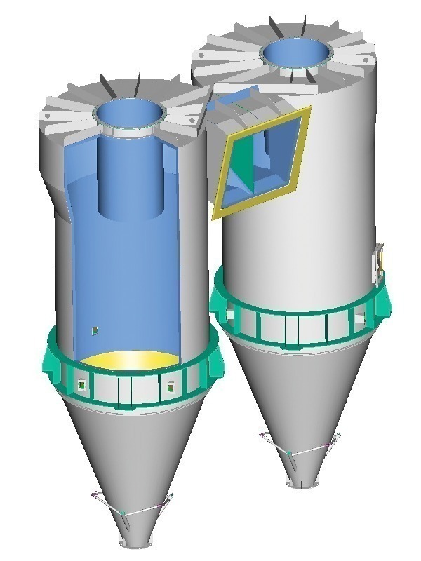 are used mainly in the dedusting of gases with low loads, where separation is performed mainly in the cyclone vortex by means of centrifugal forces. For this reason, it is important to maintain the velocity vectors. Especially since their directed contributions go to the second power into the centrifugal forces, which has an effect on the accelerated particles.