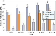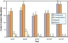 Cement consumption in Turkey remained approximately constant in 2009 at 40 Mta (Fig. 3). Cement output rose by almost 3.5 Mta, which is due to an increase in cement exports. For 2010 a slight decline in exports is feared, because important purchasers of Turkish exports are increasing their domestic production capacities. Local cement consumption is expected to rise by 5.8 % to 42.3 Mta. This will bring up the per-capita cement consumption from the last figure of 535 kg to 559 kg. Production will remain practically constant at 54 to 55 Mta. This constellation is not expected to change appreciably before 2013. Cement output will stay at today’s level of 54 Mta, with the emphasis shifting from exports to slightly higher domestic sales.