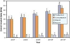Figure 2 shows the development of cement demand in the region, extrapolated until 2013. From 2007 until 2008 cement consumption rose by 8.7 % to approx. 220 Mta. In 2009 cement consumption stagnated and the average per-capita consumption sank from 448 kg to 440 kg. Subsequent to this slump in cement consumption, it appears that an upswing of 9.4 % is possible in 2010. Up to 2013, an increase to 285 Mta or an average per-capita consumption of 531 kg is anticipated. The region is developing from a net importer into a net exporter of cement. Imports are set to drop by around 10 Mta in the period 2008 to 2013, while exports have already risen by about 14 Mta since 2007. The level of exports in 2013 will not be primarily governed by the high surplus capacities expected by that date, but rather by the worldwide changes in import needs and the regions to which cement can still be supplied.