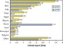 It is astonishing that Turkish cement producers managed to raise their cement exports by 3.5 Mta under the difficult market conditions in 2009. As illustrated by Figure 4, there were some drastic shifts in the importance of export destinations after exports to Russia slumped dramatically. The leading export destination is now Iraq with 3.4 Mta, followed by Syria (2.1 Mta) and Italy (1.3 Mta). Although Italy’s cement imports decreased significantly in recent years, Turkish exports made up 77 % of the imports in 2009. This is due to the relatively high shareholding of Italian companies in the Turkish cement industry. Turkey also increased its exports to Libya, Egypt and Nigeria.
