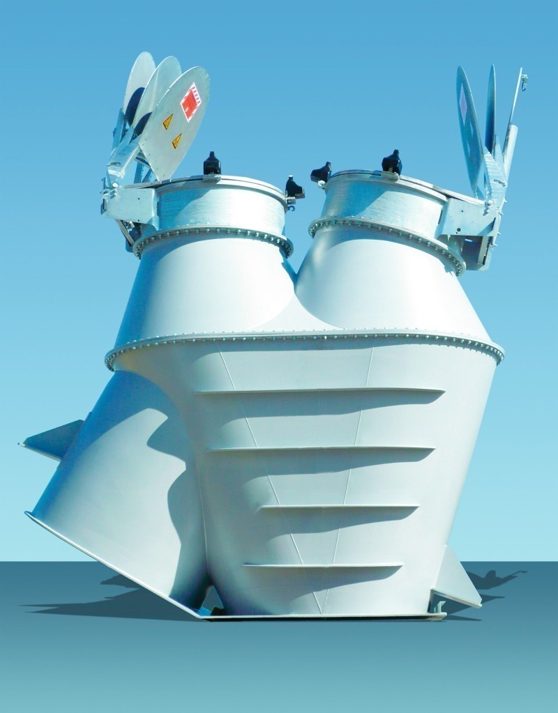 In case of coal mill dedusting plants, decoupling measures need to be provided at the pipeline between the mill and the filter and between the product discharge of the filter and the coal fines silo. Whereas decoupling of the product output can be achieved using a pressure shock resistant and flame-arresting rotary valve, with the pipeline it is important to look at the pipeline direction and dimensions more closely. However, due to the pipeline‘s large diameter, decoupling measures as described in DIN EN 15089 are not suitable. Explosion diverters (Fig. 4) offer an alternative here. The diverter comprises a pipe system with a relief device (e.g. rupture disc or explosion flap). Decoupling is achieved due to a change in flow direction from approx. 150 ° to 180 ° while maintaining the pressure relief by opening the relief device. Though a recurrence of ignition cannot always be reliably prevented but in rare cases where flames are transferred, the flame speed and explosion pressure can be reduced to a minimum. This precludes ignition by flame jet ignition and excessive explosion pressures so that the explosion protection measures provided in the design of the downstream system are sufficient to protect this [6]. Additionally, explosion diverters decouple in both directions of a plant – from mill to filter and from filter to mill.