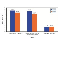 Practically all of these sales were to the construction industry, particularly the highway engineering sector. The fall in sales for this segment was, at less than 10 %, less severe than in the other sectors. How highway engineering will cope following the expiry of the economic recovery programs and the desolate budget situations of the German federal states and municipalities remains to be seen, however.