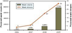 However, despite the fact that important cement production countries such as China, India, Pakistan and Turkey are only just starting to use waste materials for co-processing and their average substitution rates are still only around 5% or even less, there are a number of success stories of individual producers and plants. India has recently adopted guidelines for co-processing plants in the cement industry [14]. Beside companies like Grasim, Birla Corp., HeidelbergCement and Lafarge, ACC is one of the pioneers on the co-processing field. Figure 23 shows the rapid development of waste co-processing at ACC. While only three different types of waste material with a quantity of just under 350 t were used in 2006, ACC‘s waste usage rate already exceeded 77000 t in 2009 and the number of waste materials employed had risen to 32. The company obtains a large portion of its waste material from industrial sources which otherwise are unable to dispose of their wastes – which sometimes include hazardous substances – in an environmentally-friendly manner [15].