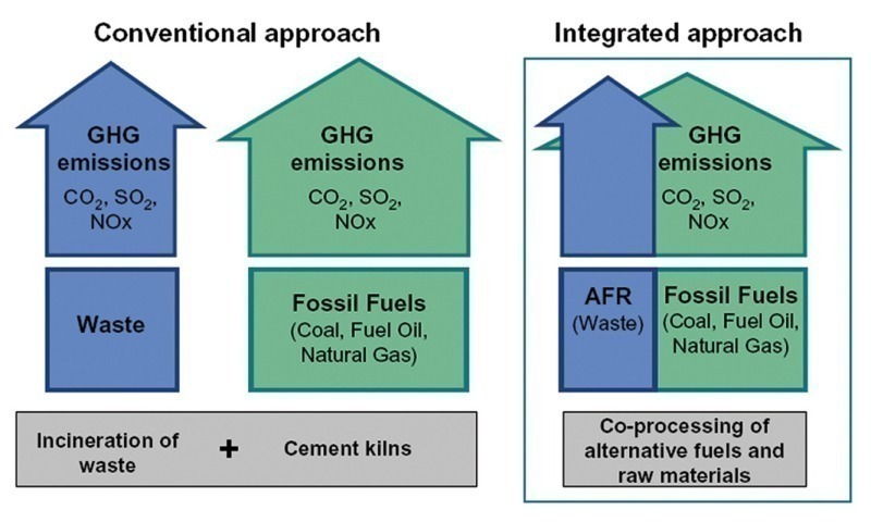 Western Europe is a world leader in the utilization of alternative fuels in the cement industry. The concept of “Co-Processing” was propagated as long ago as the beginning of the 1990s and within a few years was developed to the point of practical application in numerous cement plants [1, 2]. In contrast to separate refuse incineration and cement production, the utilization of alternative fuels instead of conventional fossil energy sources in the form of waste co-processing in the cement plant has proved to be an effective way of reducing the emission of such greenhouse gases as CO2, SO2 and NOx (Fig. 1). The waste materials are referred to as AFR (Alternative Fuel and Raw materials). Depending on the AFR usage rate, conventional fuel substitution rates of 0 to almost 100% are conceivable or already implemented or are in the process of implementation. Waste co-processing involves no alteration of the actual cement manufacturing process.