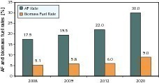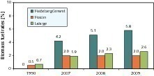 Increasing the employed usage rate of alternative fuels remains a tried and proven means of reducing the CO2, and is particularly effective if CO2 neutral biomass is used as the fuel. The rates of alternative fuel use of the three largest cement manufacturers are shown in Figure 6. HeidelbergCement leads the cement industry with its current alternative fuel usage rate of 19.5%. High alternative fuel usage rates increase the profitability of the cement production plant. The usage rate of CO2-neutral biofuels is shown in Figure 7. According to this parameter, HeidelbergCement again leads with a current usage rate of 5.8%, which also means that the company‘s net CO2 balance is improved. In contrast, Holcim and Lafarge only achieve biofuel usage rates of 2% and 2.6% respectively, with stagnating or only slightly increasing trends.