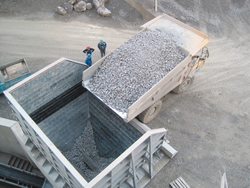 It was essential to choose the right material to meet the demands and requirements of the hopper, which is designed to handle around 500000 t rock per year. After a planning and consultation phase, the company decided to buy 1500 pieces of 50 mm thick rubber liners mounted with welded studs, to meet the requirements for up to 60 t rock per trough, with a product size of up to 140 mm. If the sharp-edged has worn out the plates can be replaced quickly and safely, at low cost, by exchanging individual plates which are quite handy with each plate weighing 5 kg and measuring 300 x 300 mm in size.