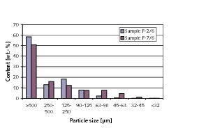 The original raw material was obtained directly from the conveyor belt. After analyzing the original, coarse-grained raw material with NIR-spectroscopy the samples were dried and crushed. The gap width of the crusher was set so that 90 % of the batch possesses an equivalent particle diameter smaller than 2 mm. The fine-grained samples were investigated with NIR-spectroscopy again. Figure 2 illustrates the coarse-grained original raw material and the same sample after crushing as fine-grained material. Obviously the coarse-grained raw material inherently contains some fine-grained material. Figures 3 and 4 show the particle size distributions of the coarse- and the fine-grained material for the two samples from Figure 2. All the other samples had similar particle size distributions.