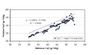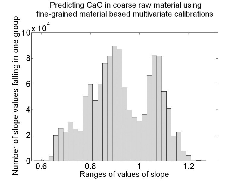 1) When using multivariate calibrations based on fine-grained material to predict the concentration of coarse-grained cement raw material as it comes out of the crusher the correlation between reference values and predicted values is preserved to a very high degree.