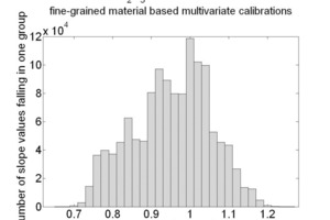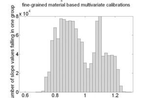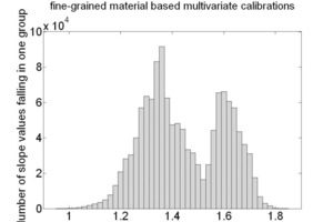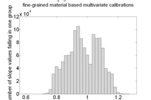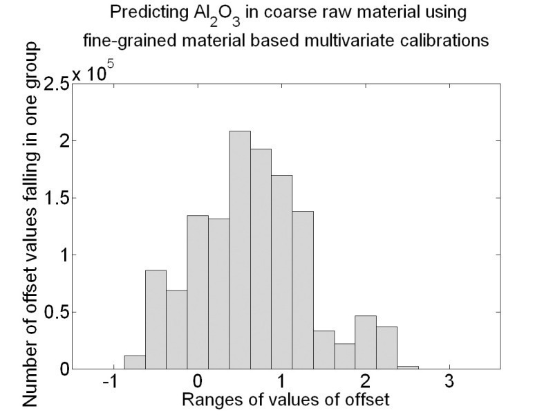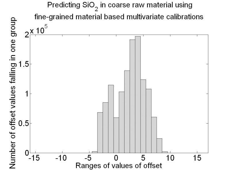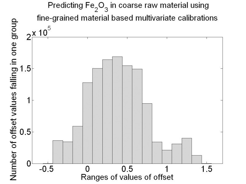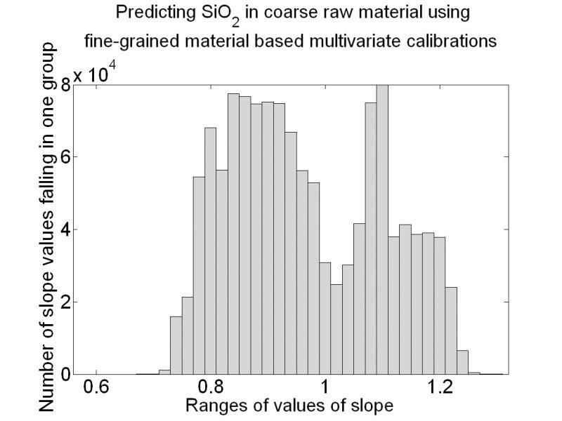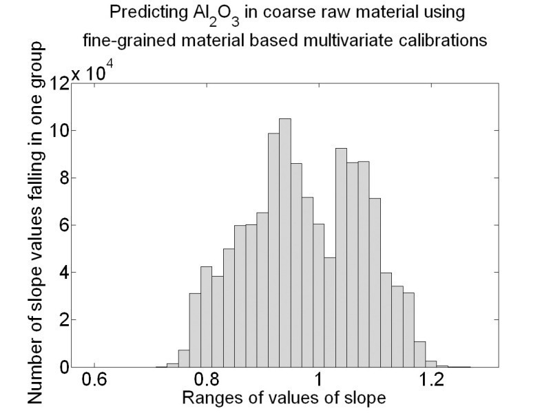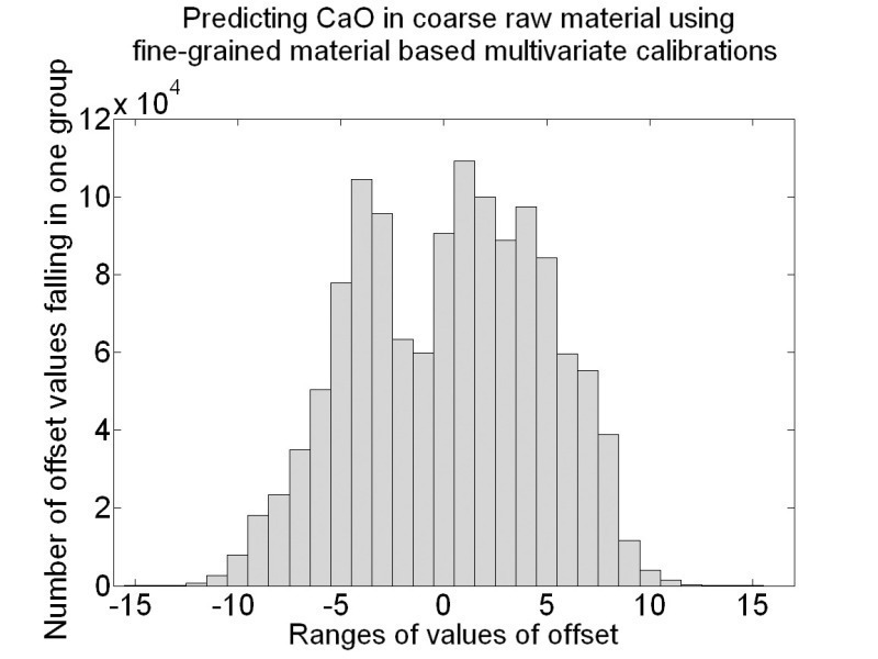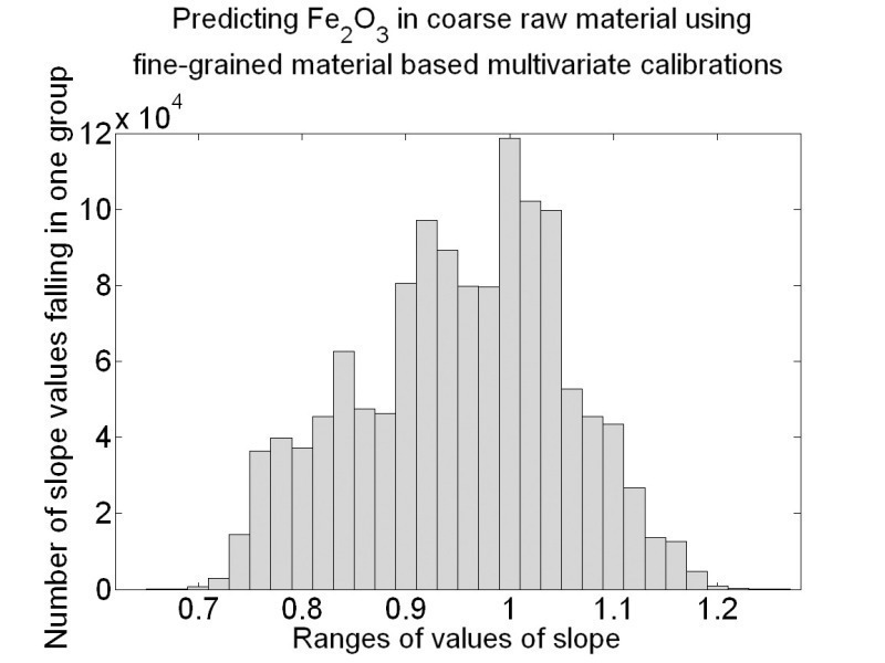 Each multivariate calibration, which was done with the NIR spectra of the fine-grained material samples, used the NIR spectra of the coarse-grained material to predict the concentration of the constituents of interest. These predictions were compared with the reference concentrations of these samples. The linear trend of the predictions, i.e. the slope and the offset value of their linear least squares fit was determined for each of the 1 280 664 cases. The subsequent histograms show the slopes of the linear fits and the resulting offset of the linear fit of the 4 key oxides, CaO, SiO2, Al2O3 and Fe2O3.