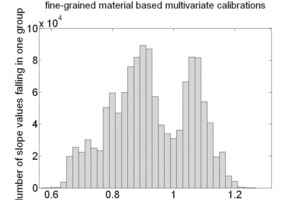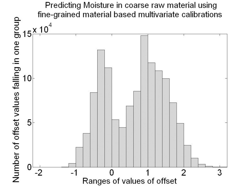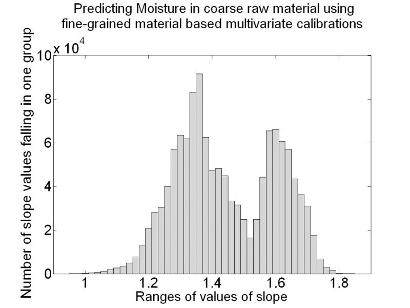 In the case of moisture content, the slope histogram shows slope values generally greater than unity (Fig. 16). All constituents (i.e. CaO, SiO2, Al2O3, Fe2O3 and moisture) showed that signal pre-processing is the key determining factor for the offset variations.