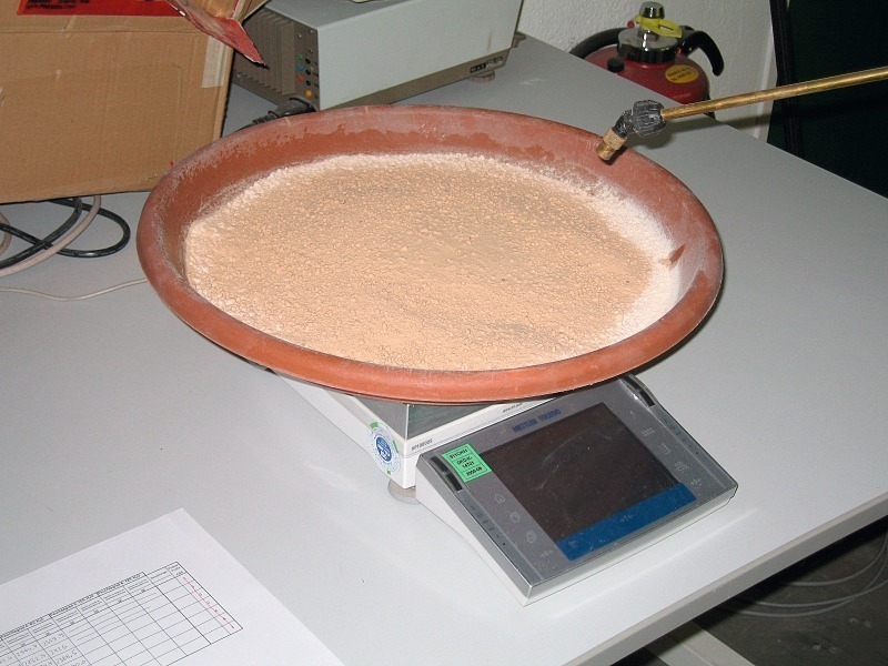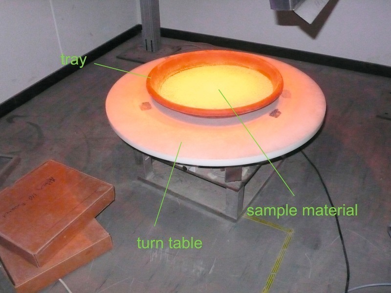 Then the samples were allowed to cool down. Within this cooling period a sample starts to capture moisture from the ambient air. The weight of the sample was determined again just before the acquisition of the first spectra. For each moisture level a defined amount of water was sprayed across the sample and then the sample was weighed (Fig. 5). The number of moisture levels has been evaluated experimentally in advance. After having added the water, a total of five NIR-spectra were acquired. Before each scan the sample was mixed in order to take into account the variable position of the coarser or finer particles and the possible heterogeneity of the sample containing more or less moisture. Each NIR-spectrum was recorded by placing the sample on a turntable to approximate the situation on the conveyor belt (Fig. 6). After having recorded five NIR-spectra, the sample’s weight was determined again in order to take into account possible evaporation effects during scanning.