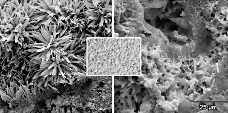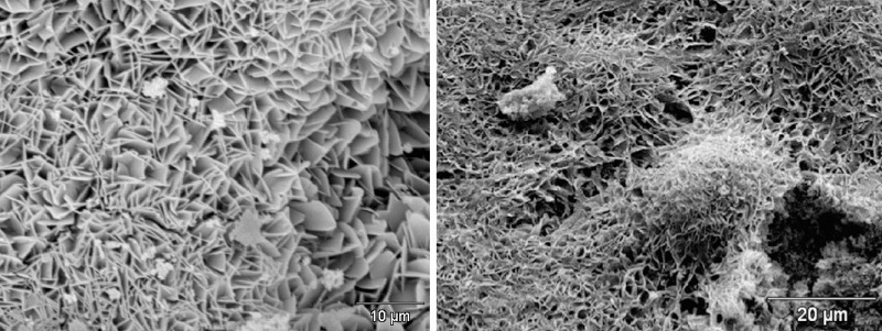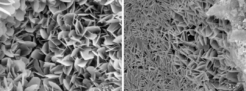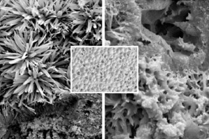 Figure 2 shows examples of two scanning electron photomicrographs of the bonding phase of one of the AAC batches under investigation (P2-0.35). As a rule the bonding phase in hydrothermally hardened building materials consists of tobermorite, which occurs with widely differing morphology depending on the hardening conditions of temperature, pressure and hardening time. In this case the tobermorite is present predominantly in the house-of-cards structure that is beneficial for the working properties.