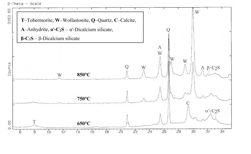 9 Å tobermorite only exhibited a peak drift of about 0.2 ° 2q in conjunction with slight line broadening, which indicated a decrease in the crystallinity of the resulting CSH phases. The conversion of gypsum via hemihydrate to anhydrite was also observed. Figure 4 shows that complete decomposition of the tobermorite phase with simultaneous formation of fresh dicalcium silicate and wollastonite was detected in the temperature range from 650 °C to 850 °C.