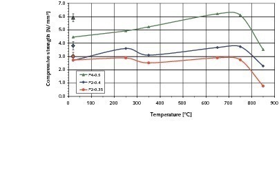 By drying the test pieces to constant weight the compressive strengths were increased significantly compared with the samples conditioned to a material moisture content of 6 %. On average, the rise in compressive strength was 16 % for P2-0.35, 27 % for P2-0.4 and 23 % for P4-0.5. Surprisingly, the average compressive strengths of the samples of all three types of AAC dried at 105 °C were approximately the same as the compressive strengths measured in the temperature range from 650-750° C (Fig. 9).