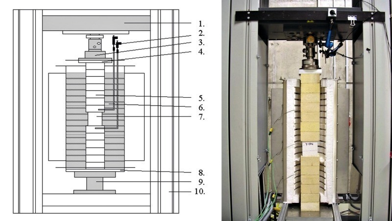 Hot-creep tests were used to determine the strain under compression (ew) of the corresponding AAC block material. After it had been installed, the test specimen was heated dynamically at 2 K/min under constant load until failure. The preselected loads corresponded to 25 %, 50 % and 75 % of the reference failure stress at 20 °C. The deformation of the test specimen caused by the loading or temperature change was measured in the vertical direction by quartz glass rods from outside the kiln zone using inductive displacement transducers. The load was introduced into the kiln through fireclay bodies (Fig. 1).