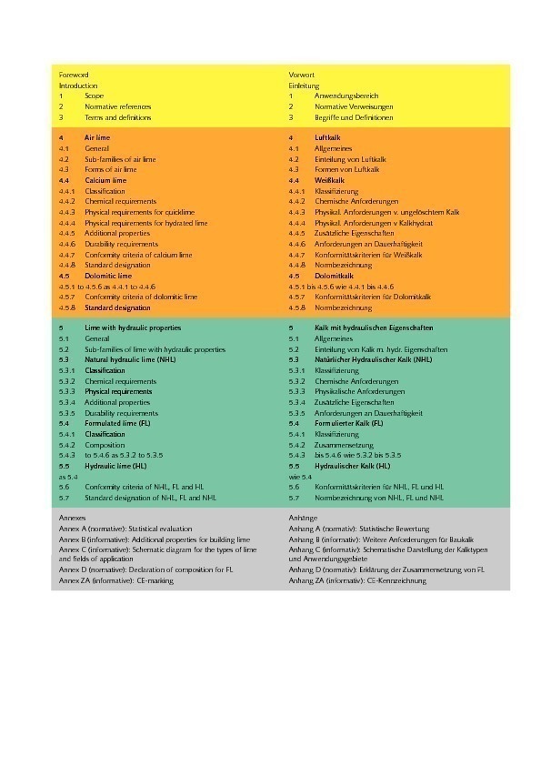 The new building lime standard is notable for clear classification of building limes into air lime (calcium lime and dolomitic lime) and lime with hydraulic properties (natural hydraulic limes [NHL], formulated lime [FL] and hydraulic limes [HL]), separate sections containing the conformity criteria, and restructured annexes. This new structure is illustrated in Figure 2, and makes the comprehension and application of the standard significantly easier (Fig. 3).