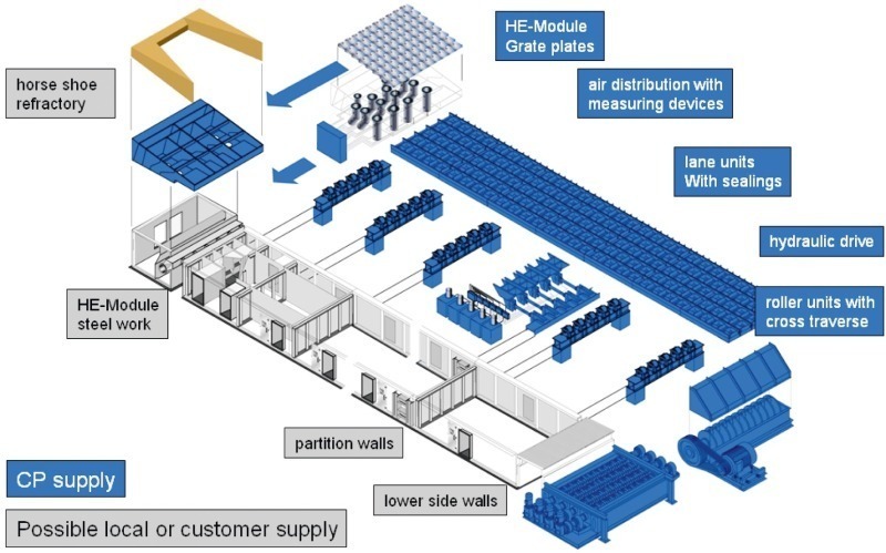 Against this background, we have further developed the ETA Cooler. Especially for new greenfield pyro-lines we have modified our ETA Cooler design to allow maximum customer supply. The parts that determine the clinker cooling process such as the HE-Module grate plates and aeration box, aerated lanes and sealings, roller units and hydraulic grate drive will be complete the Claudius Peters supply. This ensures highest fabrication precision at proven manufacturing plants.