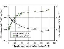 Example: if the water/plaster value is reduced from WGWref = 0.75 to WGW = 0.60, the energy requirement for drying decreases by ∆E @ 27 %. In the case of a plaster containing soluble anhydrite the above calculation approach has to be suitably modified. However, the energy saving potential remains unaffected.