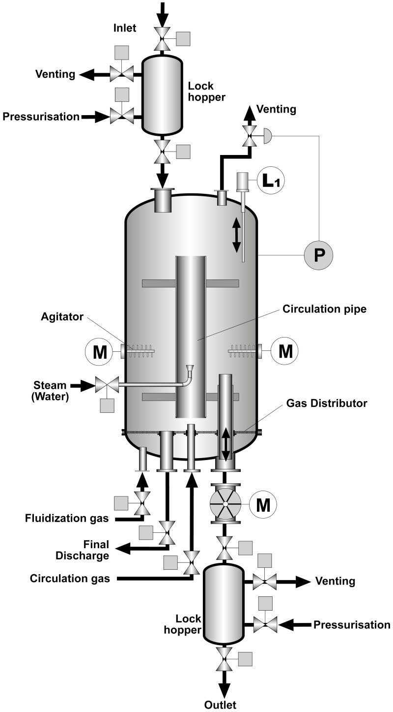 The main technical data of the CP test homogenizer are: fluidized bed diameter DR = 1.0 m; maximum fluidized bed height HR,max @ 1.3 m; overall height of reactor Hges @ 2.6 m; inside diameter of circulation pipe DC = 212.7 mm; permissible reactor overpressure pR = 3.5 bar overpressure; plaster throughput M˙G ≤ 500 kg/h; reactor completely thermally insulated with electrical heating underneath the insulation; fluidization gas and circulation gas heated up by electrical heating coil in the supply pipe; electrically heated water vapour generator; including pressure maintenance, inlet and discharge systems; complete set of instruments with control system and integration into the higher-level calciner system.
