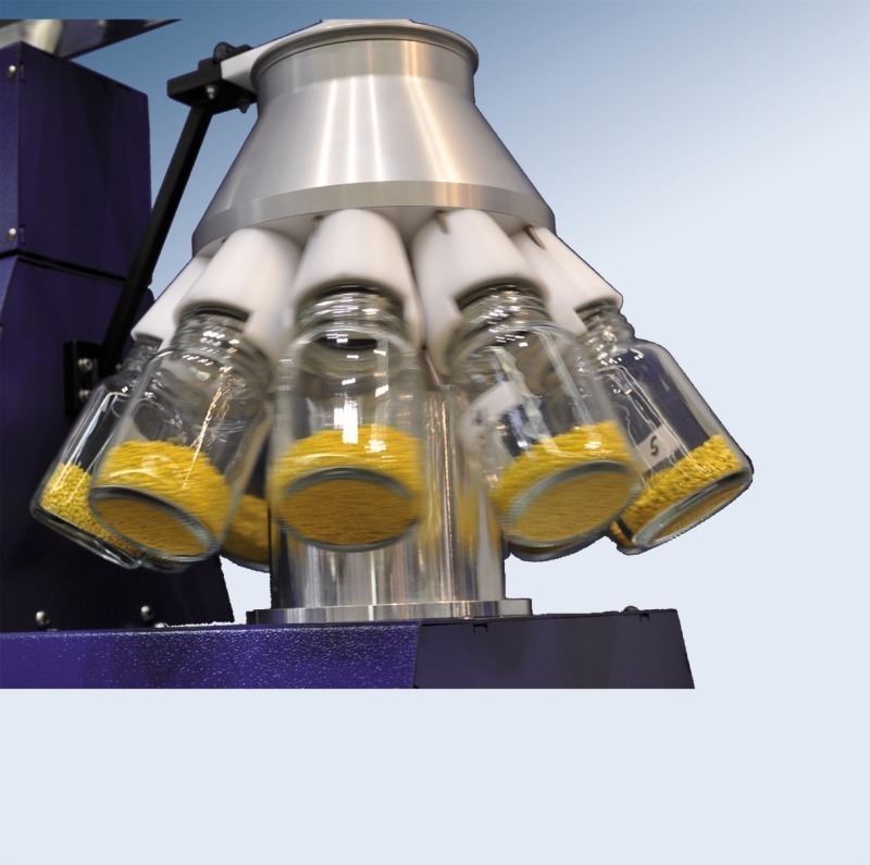 The sample splitter HAVER RPT (Fig.) prepares small but representative samples of solids and suspensions and is combined with high-precision measuring instruments. It is used in laboratories for research, development and process monitoring. Rotary sample splitters combine three splitting processes in one device and offer the best sample division that is possible today. The sample is fed to a splitting cone, the shape of which corresponds to quarters and cones. The sample material is accelerated outwards on the circumferential surface of the cone and is split up through guide ducts into max. 30 individual flows. The individual samples are collected in screw cap glass bottles of 250 ml and 500 ml that can be fixed in place easily and safely by means of a quick-acting clamping device. Variable division ratios of up to 3000 division steps per minute are possible due to the rotation and the number of division ducts so that each sample consists of a very large number of individual samples – a feature of exact sample splitting. Thus, the rotary cone sample splitter HAVER RPT achieves a precision of 99.9 %. In this way, it is possible to split even poor-flowing materials, e. g. cement or limestone, with high precision.