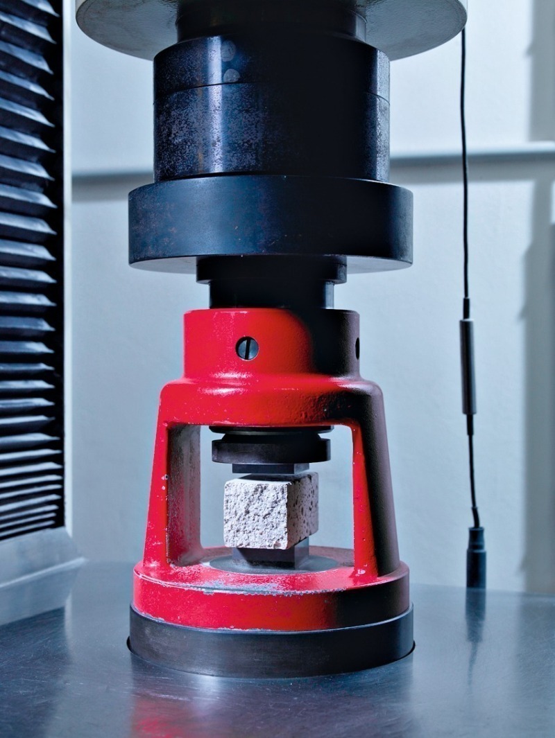 When starting the revision of the EN 459-2, it was laid down that this standard, in particularly as regards the physical methods, had to be redesigned and that all procedures are described in this part of the standard so that only the reference to the EN 196-1 is left for the compressive strength test (Fig. 1) as regards the equipment. The chemical analytical procedures are extended by the gravimetric determination of CaO, MgO and CO2, of the loss on ignition and of the available lime. The EN 12485 is the basis for some procedures. This European standard was introduced in 2001 and describes the test procedures for lime products that are used in drinking water treatment.