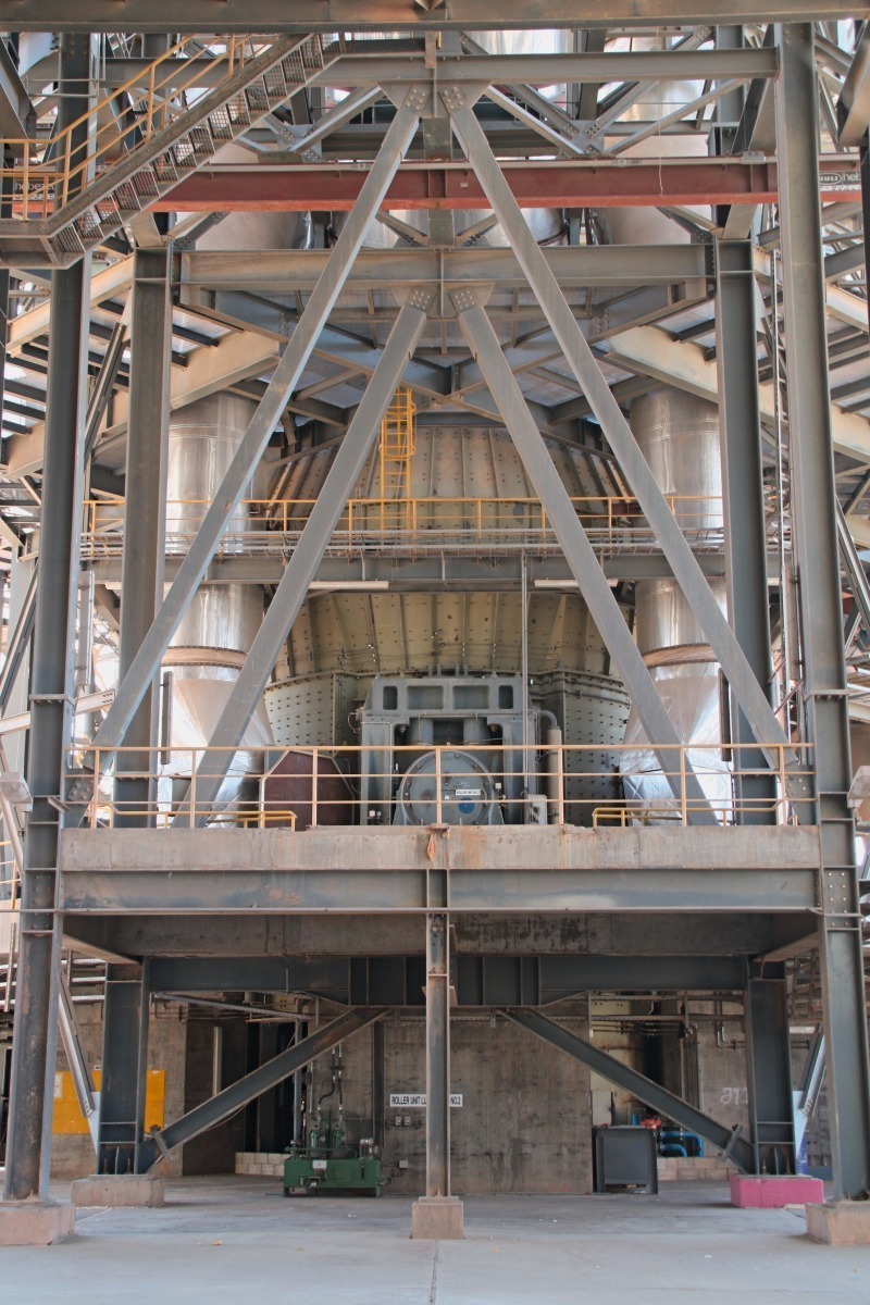 The feed materials for grinding in the mill to meet the raw mix formulation are stored in four intermediate hoppers, and are metered by means of separate weighfeeders. 90 % of the raw meal produced using the vertical roller mill (VRM) is collected on the cyclone, and the remainder in the main baghouse; this material is then conveyed to IBAU blending silos. Filtration on the baghouse downstream of the cyclone ensures that only dust-free air is released to the atmosphere. The hot gas required for grinding is tapped off from the preheater waste gas. The raw meal is extracted from the silo and routed into the kiln feed bin, before being fed into the kiln system.