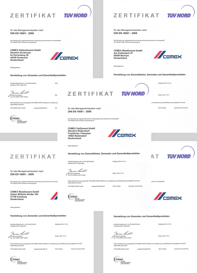 In November 2011 the newly introduced CEMEX energy management system was successfully certified by TÜV-Nord in the five German cement plants according to the DIN EN 16001:2009 - energy management systems. The CEMEX energy management system met the requirements of the standard at the locations of CEMEX West-Zement GmbH (Beckum, Duisburg-Schwelgern), CEMEX HüttenZement GmbH (Dortmund) and CEMEX OstZement GmbH (Rüdersdorf near Berlin, Eisenhüttenstadt). “The excellent data collection and data preparation by the local colleagues was particularly helpful”, said Ralf Korsen, Energy Management/Energy Tax of the parent company CEMEX Deutschland AG. “Actually energy management is part of the core business in the cement industry, and in our daily business and in reportings we already use the essential elements of energy management. This enormously facilitated the certification.”