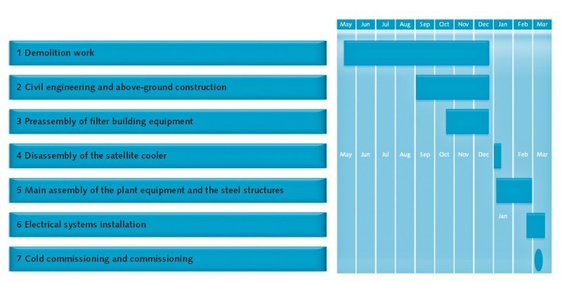 IKN were required to dismount the existing components and assemble the new equipment within a period of 55 days. This ambitious target demanded not only precise planning, but also excellent co-operation between all the companies and people involved (Fig. 8). The assembly concept was based on the principle of maximising the degree of completion during preassembly in order to minimise the amount of work required during the plant stoppage.