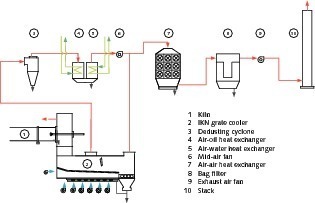 In the conventional cement manufacturing process the grate cooler recuperates approximately 75 % of the heat from the clinker leaving the kiln. The largest portion of the recovered heat is used to preheat the combustion air: as secondary air for the main burner and as tertiary air for the the calciner. In Rohrdorf, the kiln hood was dimensioned to permit extraction of tertiary air from the hood in the event of a future kiln system modification to operation with a precalciner. The prepared openings have been initially closed off with blanking plates. To cool the clinker to 65 °C, more air is required than can be extracted for the pyroprocess. Usually, the surplus air is drawn from the clinker cooler as exhaust air and, with a high percentage of waste heat, cooled and released into the atmosphere via a filter.