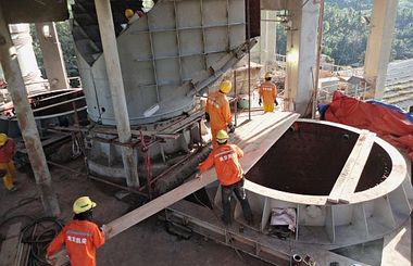 The hot gas ducts were refractory lined as far as possible during preassembly on the construction site, so that it was only necessary to line the butt joint zones after installation. Whereas it was possible to install the refractory lining in the double cyclones while they were lying on the ground, for weight reason lining of the kiln hood by means of jetcasting had to wait until the hood had been installed in its final location.