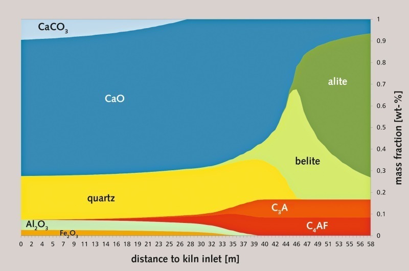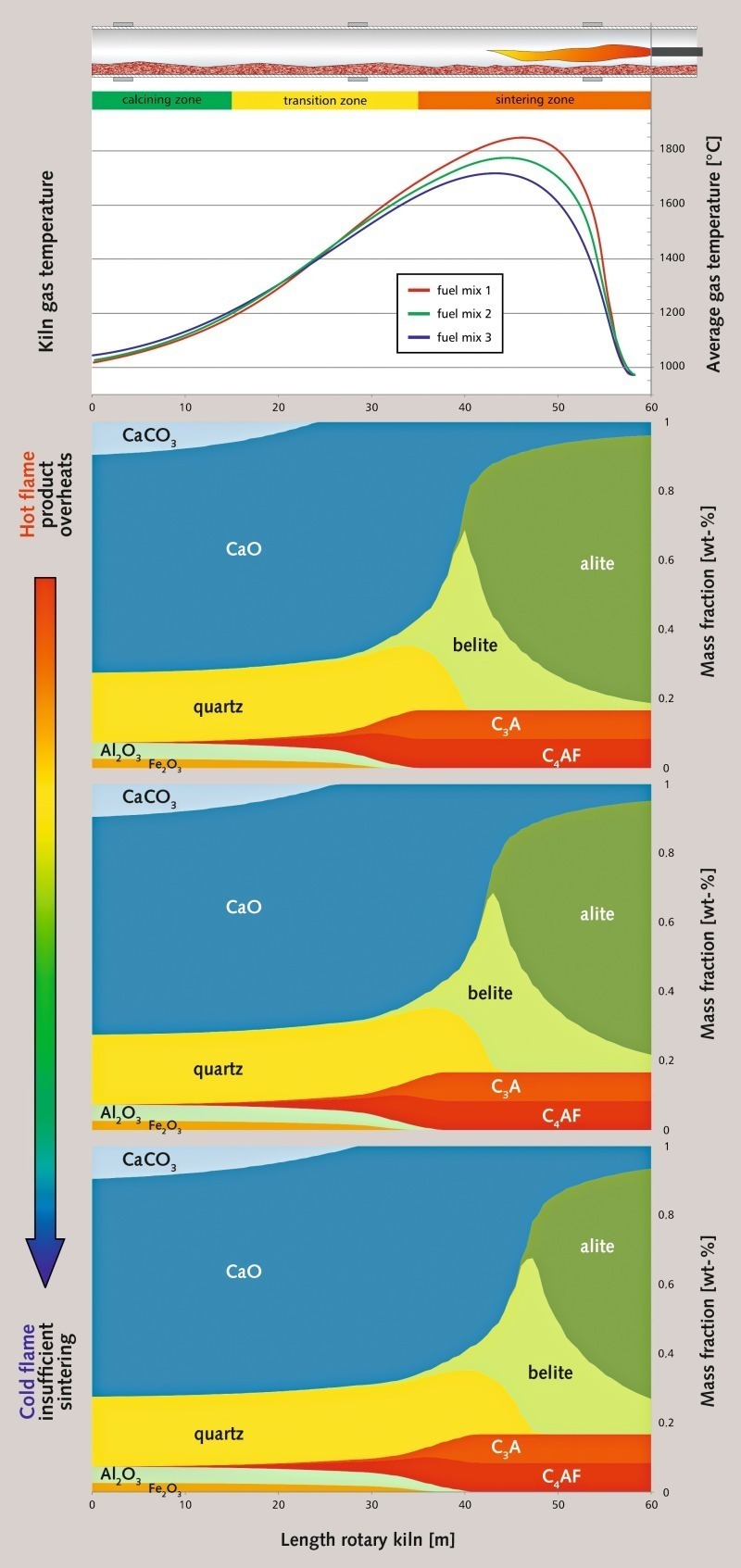 The combination of combustion and material bed enables a prediction of the product formation. It also demonstrates the progression of the clinker phase composition along the rotary kiln as generated in the simulation in the form of a typical phase diagram for the cement industry (Fig. 4). In this way, the effects of a flame of varying heat on clinker formation can be reproduced in the simulation (Fig. 5).