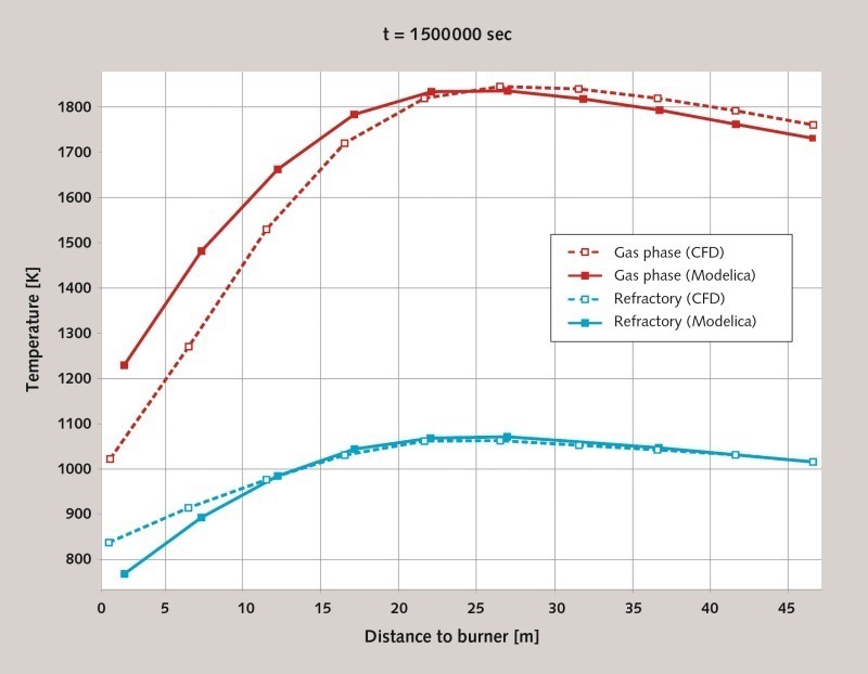 The commercial software package Dymola was used to develop a reduced 1D-model [4]. The gas phase was provided with a chemical reaction model that describes the fuel reactions based on a general Arrhenius approach. The parameters of the reaction kinetics were used to lead the ideal 1D-model (Fig. 7) toward the results of the CFD model. The pseudo reaction kinetics generated in this way take into consideration both the temperature dependency and the influence of local flow and mixture relationships that arise from the specific plant set up.