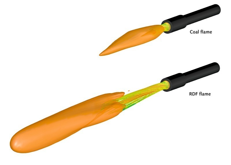 Taking all air and fuel flows at the burner into consideration, the CFD simulations provide insight into the combustion behavior of the various fuels, which is primarily limited by substance transport. Figure 2 shows an approximate illustration of the flame contour of a coal flame for a multi-channel burner.