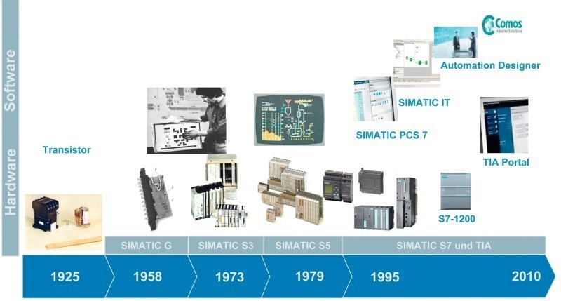 In the beginning, the application of automation technology was limited to large-scale production lines. Today, it is also possible to automate even small plants through the use of more flexible automation technology. The first electronic controllers were hard-wired systems. The flexibility was correspondingly low and the functionality was extremely limited. The new transistor, with its signal amplifying function, triggered a real boom in automation. As early as 1955, Siemens developed the first control circuits using germanium transistors.