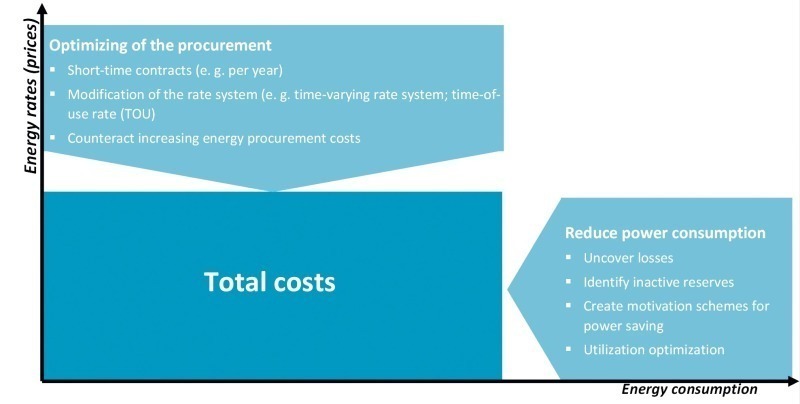 When optimizing systems, it soon becomes clear that losses can only be detected if the consumption levels of the different parts of the system are known in detail and can be compared. Modern energy management systems are based on standardized components, which are present in large numbers in the system and can thus be easily and effectively used for recording. In addition to recording the electrical energy, all of the other forms of energy should also be recorded in order to create overall transparency, because energy management is implemented at many levels in an industrial plant. Beginning with the field level, the required basic data is acquired via corresponding “sensors” in order to later be prepared and compressed in the assigned controllers. This data is now made available to the operators. This also includes the defaults of the load management for the connecting and disconnecting of plant units. The control center personnel can generally accept these defaults or refuse them (during critical system situations) or move them within value range (temporarily).