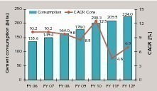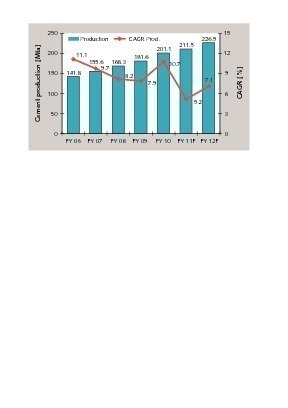 This report is only concerned with the market segment of major production plants. With a production volume of 212.5 million tonnes per year (Mta) in FY11, India is the second largest cement market after China. At the end of FY11, there was a total of 45 cement manufacturers with169 large plants and a cement production capacity of 291.3 Mta. This figure does not include 365 mini cement plants and white cement plants with a capacity of 11.1 Mta and a production volume of 6.0 Mta. As India has a low per capita cement consumption of 174 kg (FY11) although cement consumption has more than tripled since 1995 and cement consumption growth has always been higher than economic growth since 2001, the prospects with regard to future growth have been extremely positive. In 2011, the economic growth was 7.8 % after 10.1 % a year earlier. However, cement sales did not come up to expectations and production figures have recently faltered.